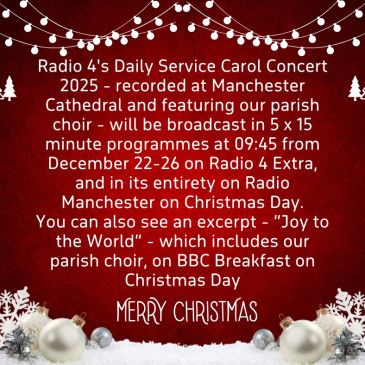 By now all readers of this blog will be aware that our parish choir took part in the BBC’s recording of the Radio 4 Daily Service Carol Concert at Manchester Cathedral early in December 2025. It was a truly amazing event to be part of! This is what some of our singers said: Christmas started … More Radio 4 Daily Service Carol Concert